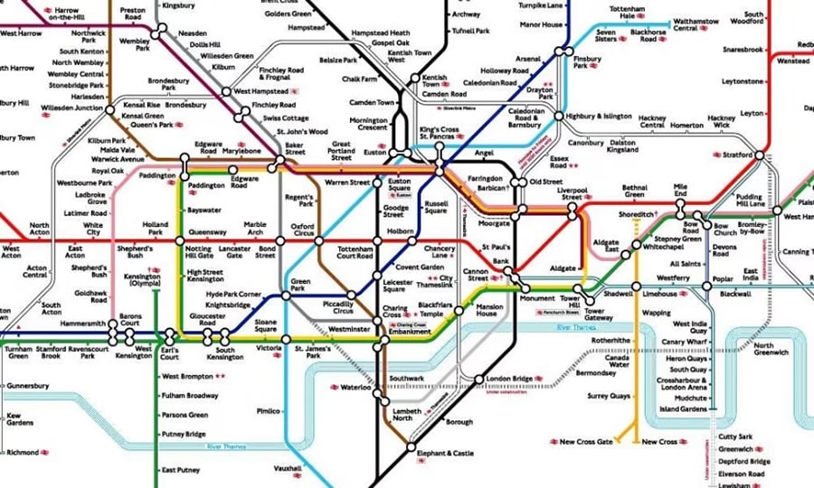 Aunque cada línea tiene un color asignado, en Londres la gente se refiere a las líneas por su nombre, no por su color (por lo que te recomiendo que si tienes que preguntarle a alguien lo hagas refiriéndote al nombre de la línea).