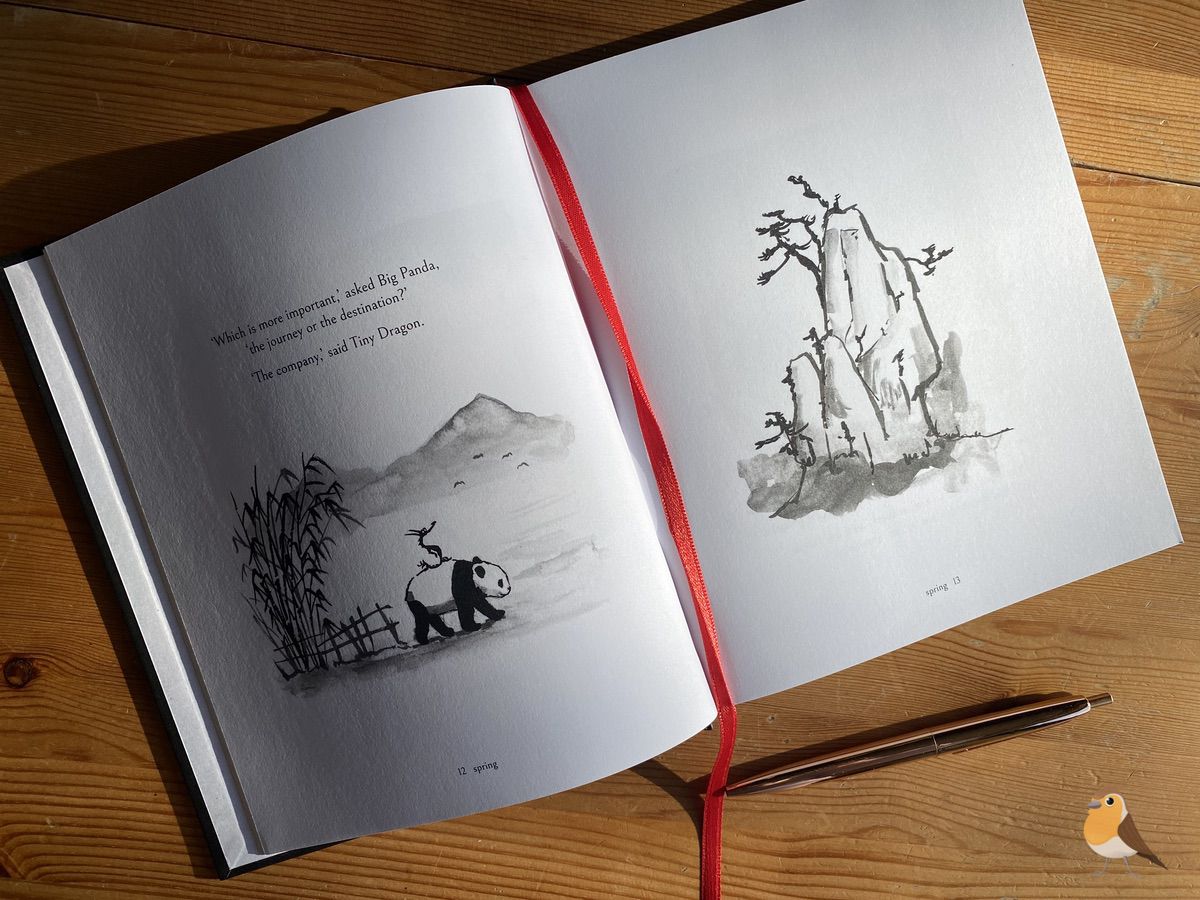 Gran panda y pequeño dragón es un libro similar a uno que os recomendé hace tiempo y del que sigo enamorada, El niño, el topo, el zorro y el caballo. Ambos libros tienen unas ilustraciones bellísimas y frases llenas de sabiduría. El mensaje de los dos es muy potente, una lección de vida. Son libros para tener siempre a mano, en la mesa de café por ejemplo, para ir ojeándolos cada vez que lo necesites. Puedes abrirlos por cualquier página al azar y seguro que te van a recordar algo importante, algo esencial.