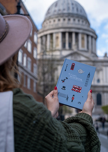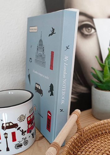 Nuestra fantástica libreta incluye un diseño inspirado en los principales elementos que caracterizan a la capital del Támesis. Incluye imágenes de los famosos autobuses rojos, cabinas telefónicas, teteras de porcelana, bancos y farolas de los parques, así como personajes icónicos como Sherlock Holmes y Mary Poppins.
